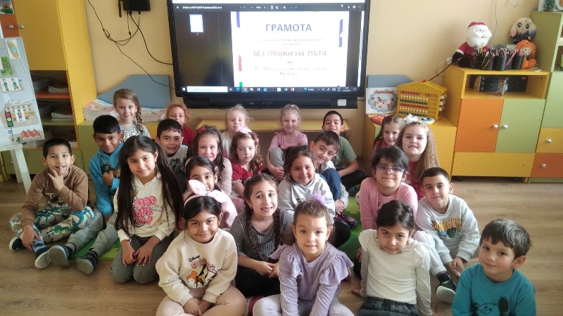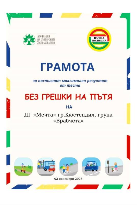 "Врабчетата" взеха участие в провеждането на четвъртото издание на играта „Без грешки на пътя“, което се реализира в периода 01 – 12.12.2025 г. по инициатива на Асоциацията на българските застрахователи и Главна дирекция „Национална полиция“ – МВР. ориентиран към малките участници в пътното движение. Нашите участници се справиха отлично, като отговориха безпогрешно и на десетте въпроса!