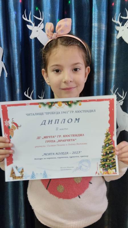 Щастливи сме, че нашите талантливи деца са наградени на второ място в конкурса :"Моята Коледа"- 2023г., организиран от читалище " Пробуда" - 1961г. град Кюстендил. Децата от група "Врабчета" участваха с изработването на картички.